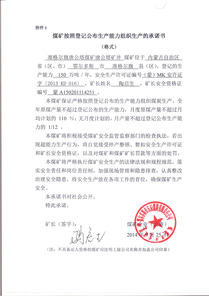 准格尔唐公塔煤矿唐公塔矿井生产承诺书