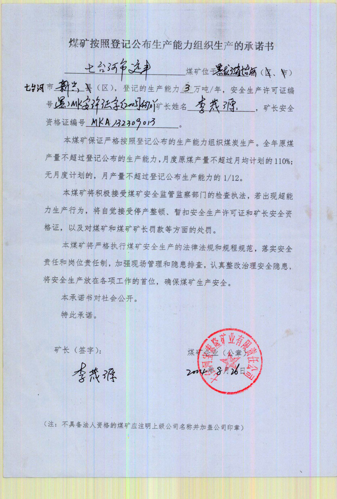 七台河市远丰煤矿生产承诺书