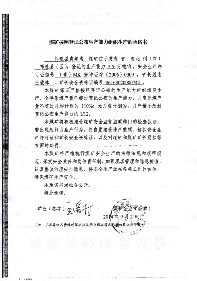 青海青羊沟煤炭开发有限公司祁连县青羊沟煤矿生产承诺书