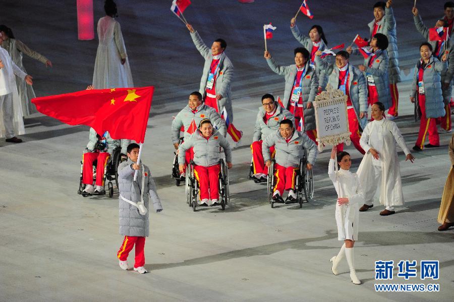 3月7日,中国代表团在开幕式上入场。当日,第11届冬季残奥会开幕式在索契菲施特体育场举行。45个国家和地区的近550名运动员将在本届残冬奥会中角逐高山滑雪、冬季两项、越野滑雪、轮椅冰壶和雪橇曲棍球5个大项、72个小项的比赛。新华社记者戴天放摄