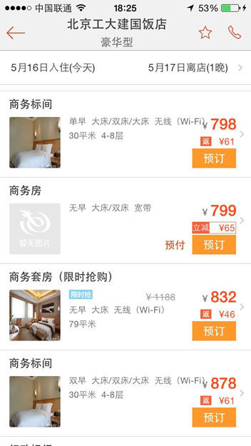 华威桥工大建国饭店房间标价。