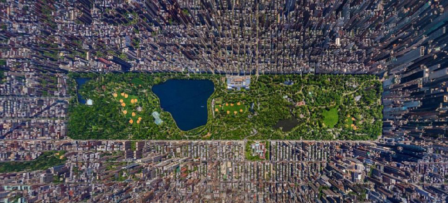2014年6月7日,每日邮报发布一组航拍照片,展示了地球上世界各地城市或景观在空中鸟瞰时展示出不可思议的壮丽景色。图为美国纽约曼哈顿中央公园的绿色灯塔像摩天大楼一样闪闪发光