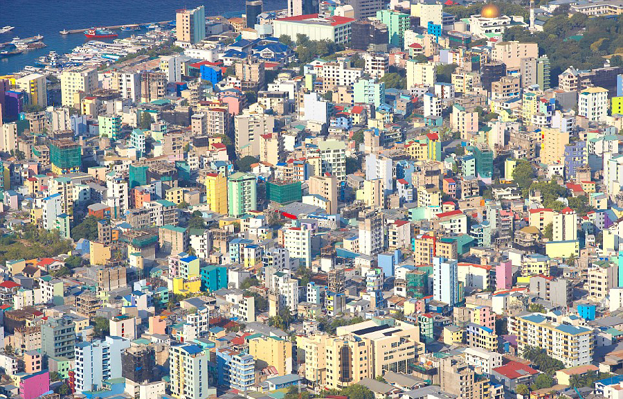 2014年6月7日,每日邮报发布一组航拍照片,展示了地球上世界各地城市或景观在空中鸟瞰时展示出不可思议的壮丽景色。图为马尔代夫色彩明亮的楼房
