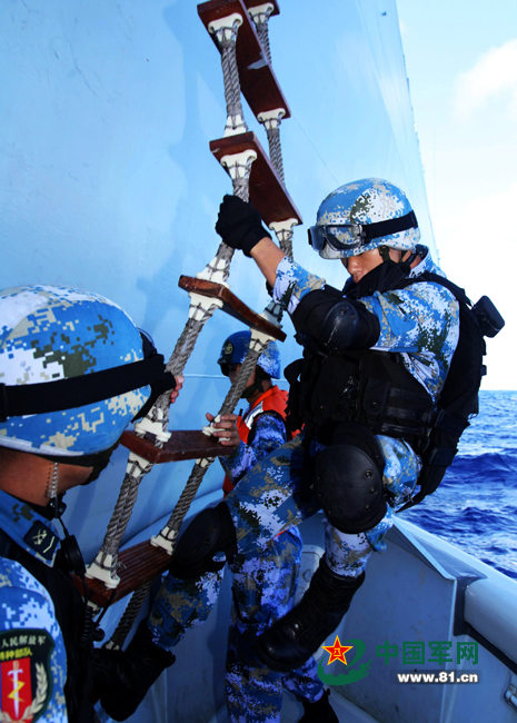 海口舰特战队员离舰登上小艇。于林摄