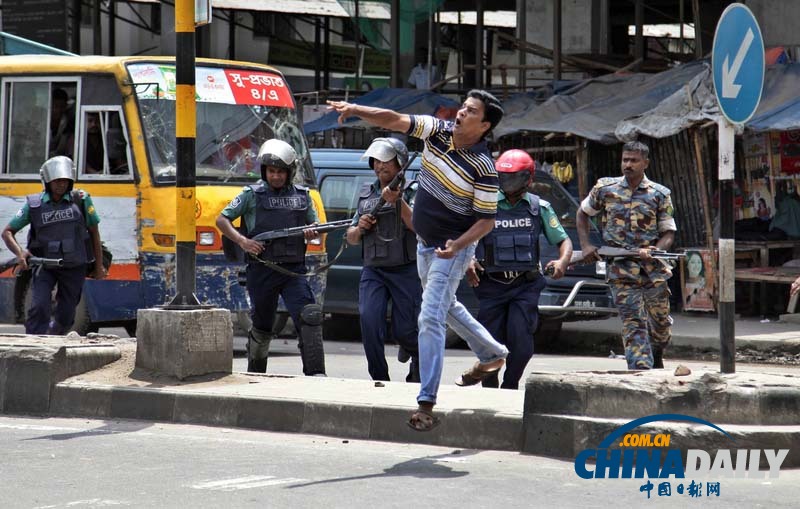 当地时间2014年8月7日,孟加拉国达卡,一名政府的支持者朝服装厂工人扔石头。孟加拉国警察冲进一家服装厂,用催泪弹和警棍驱散从7月28日起开始绝食讨薪的工人。(图片:东方IC)