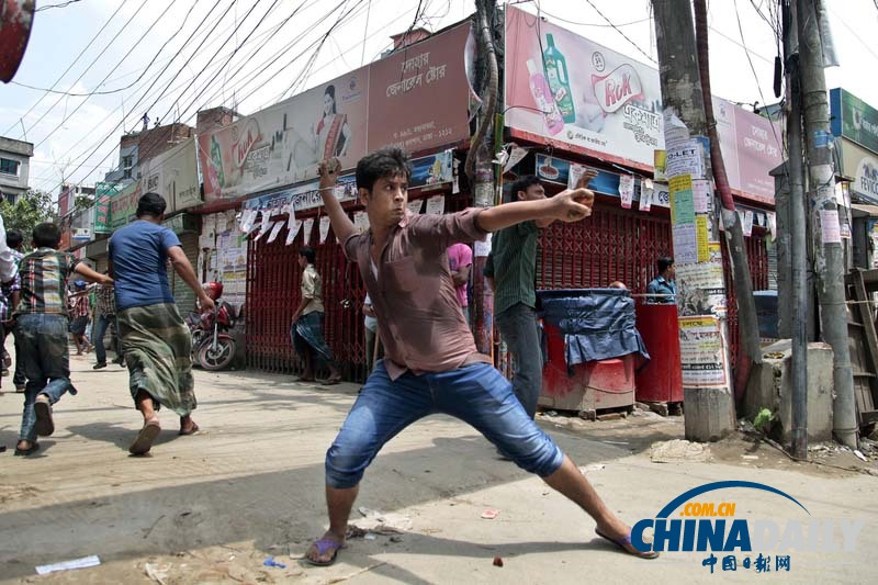 当地时间2014年8月7日,孟加拉国达卡,一名服装厂工人朝警察扔砖头。孟加拉国警察冲进一家服装厂,用催泪弹和警棍驱散从7月28日起开始绝食讨薪的工人。(图片:东方IC)