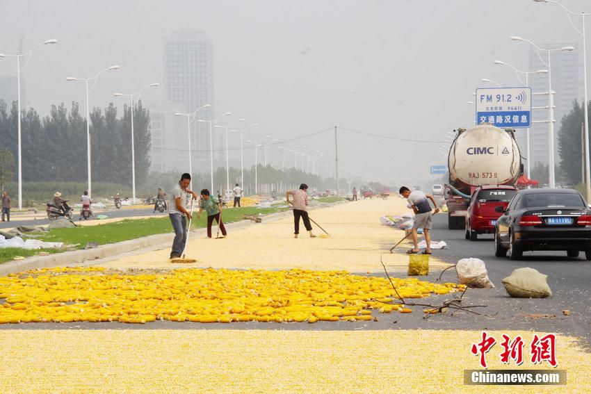 2014年09月26日,河南省郑州市科学大道约5公里长新修路段,到处晾晒着玉米,占去2/3车道,场面壮观,当地村民称之为“黄金大道”。只要天气晴好,玉米晒上两三天,就可以就地打粒,然后装车卖出。图片来源:CFP视觉中国