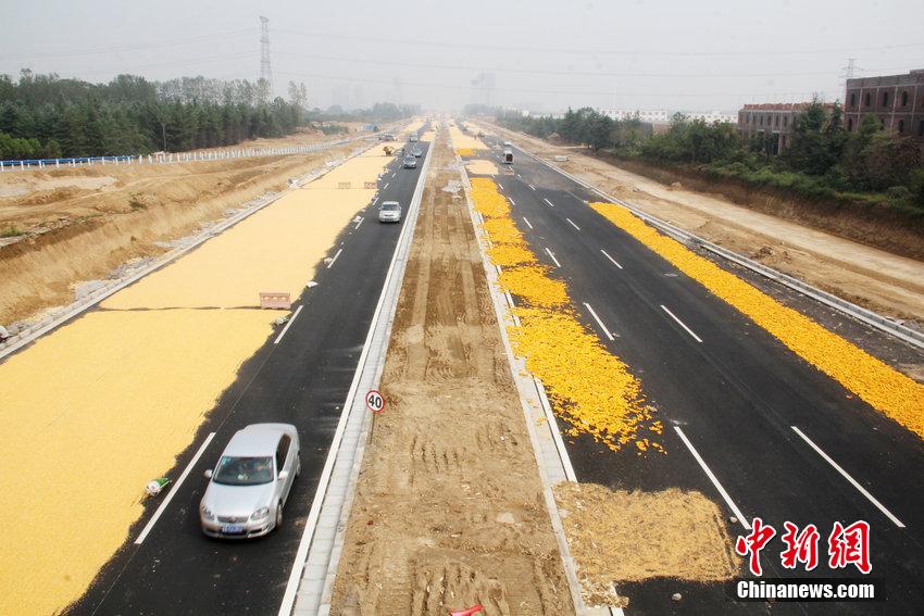 2014年09月26日,河南省郑州市科学大道约5公里长新修路段,到处晾晒着玉米,占去2/3车道,场面壮观,当地村民称之为“黄金大道”。只要天气晴好,玉米晒上两三天,就可以就地打粒,然后装车卖出。图片来源:CFP视觉中国