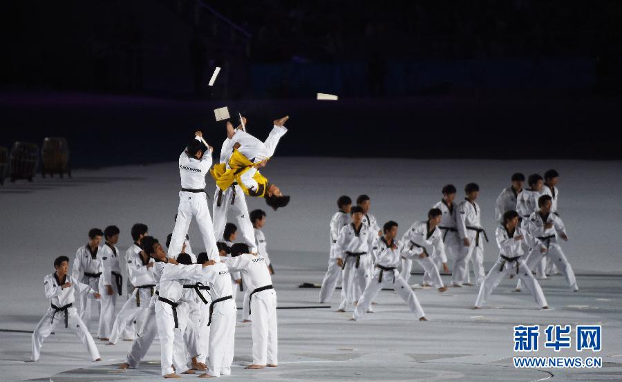 10月4日,第17届亚洲运动会闭幕式在仁川亚运会主体育场举行。 这是闭幕式上的韩国跆拳道国技院跆拳道表演。 新华社记者卢炳辉摄