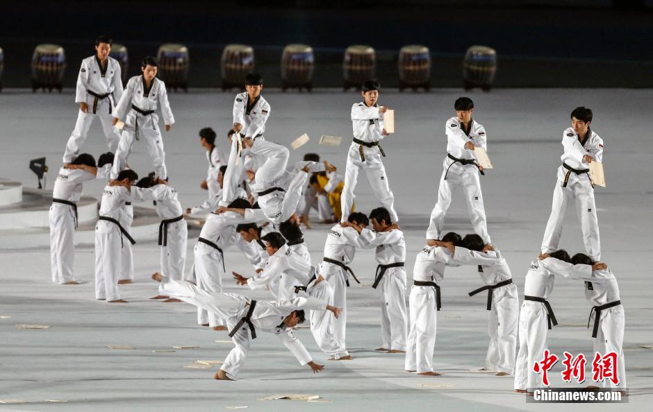 10月4日,第17届亚运会闭幕式在韩国仁川市亚运会主体育场举行。图为韩国跆拳道国技院进行跆拳道表演。中新社记者 张浩 摄