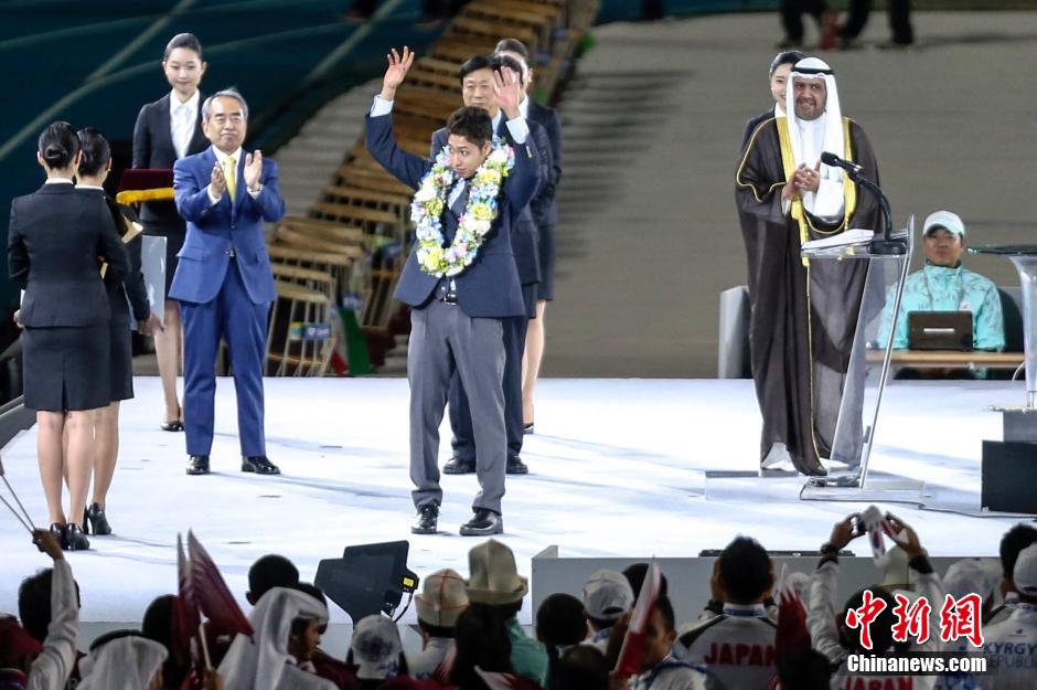 10月4日,第17届亚运会闭幕式在韩国仁川市亚运会主体育场举行,日本游泳运动员萩野公介获得仁川亚运会MVP称号,图为萩野公介向观众致意。中新社发 张浩 摄