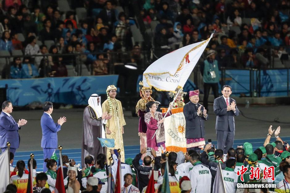 10月4日,第17届亚运会闭幕式在韩国仁川市亚运会主体育场举行。图为亚运会会旗移交至印尼雅加达主办方代表手中。