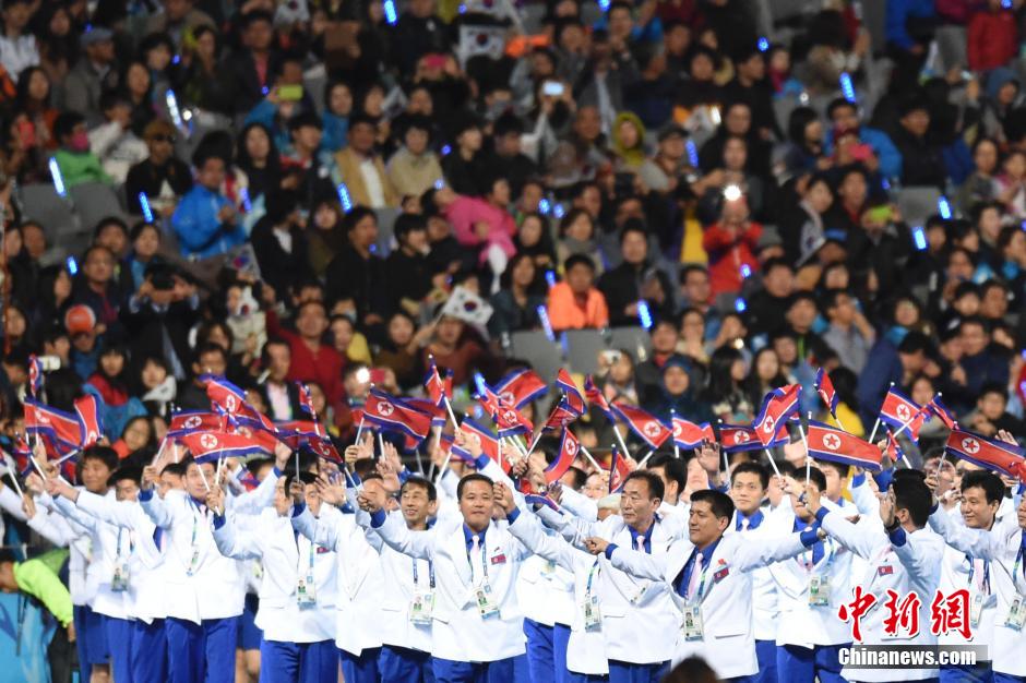 10月4日,第17届亚运会闭幕式在韩国仁川亚运会主体育场举行。图为朝鲜队运动员入场。中新社记者 廖攀 摄