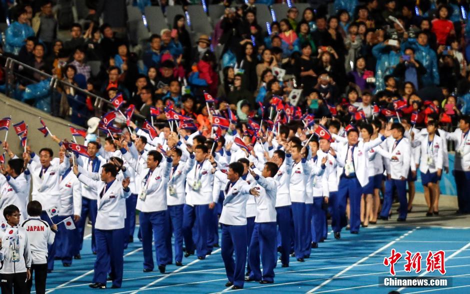 10月4日,第17届亚运会闭幕式在韩国仁川市亚运会主体育场举行。图为朝鲜队运动员入场。中新社记者 张浩 摄