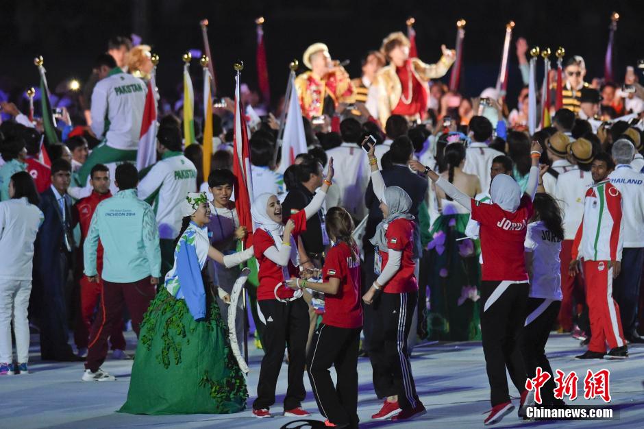 10月4日,第17届亚运会闭幕式在韩国仁川亚运会主体育场举行。图为运动员随演出起舞。中新社记者 廖攀 摄