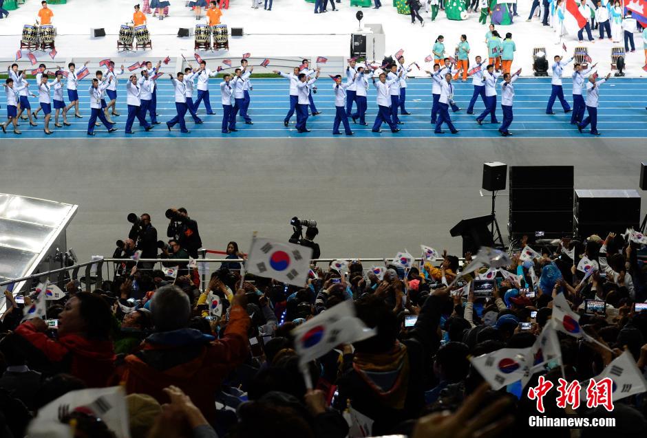 10月4日,第17届亚运会闭幕式在韩国仁川市亚运会主体育场举行。图为闭幕式上韩国观众挥舞旗帜热烈欢迎朝鲜代表团入场。中新社记者 侯宇 摄