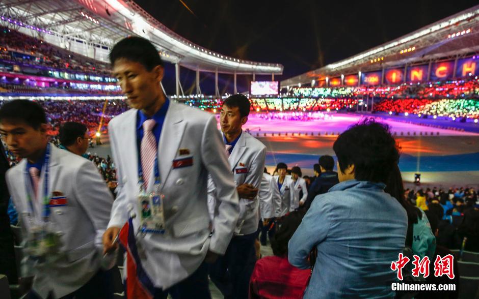 10月4日,第17届亚运会闭幕式在韩国仁川市亚运会主体育场举行。图为朝鲜代表团成员离场。中新社记者 张浩 摄