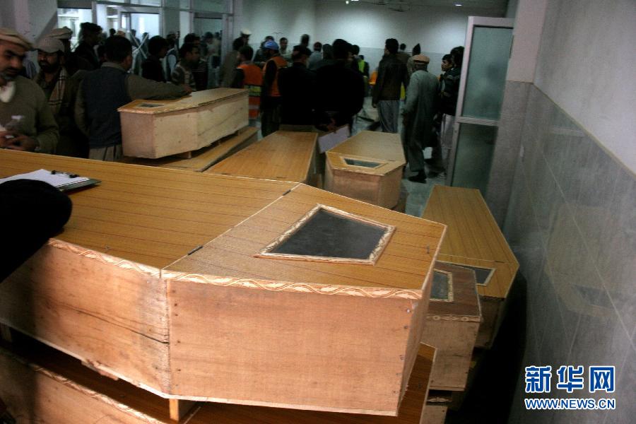 12月16日,在巴基斯坦北部城市白沙瓦,收治遇袭学生的医院堆放着棺木。据巴基斯坦媒体16日晚报道,针对白沙瓦军人子弟学校遇袭事件的救援行动已基本结束,袭击造成至少137人死亡、245人受伤,另有9名武装分子死亡。新华社发(辛迪克摄)