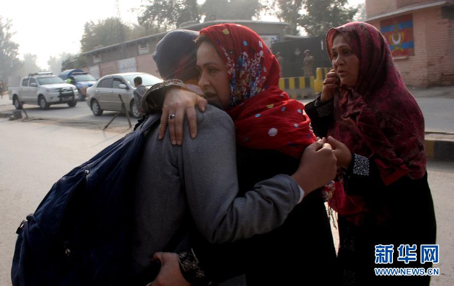 12月16日,在巴基斯坦北部城市白沙瓦,一位母亲拥抱从遇袭学校中安全脱身的儿子。据巴基斯坦媒体16日晚报道,针对白沙瓦军人子弟学校遇袭事件的救援行动已基本结束,袭击造成至少137人死亡、245人受伤,另有9名武装分子死亡。新华社发(辛迪克摄)