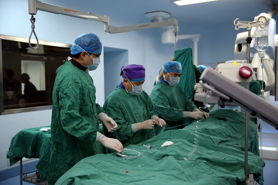 在手术室里,刘觉仕(右)、方志勇(中)和助手一起为一位肝癌患者进行手术(摄于1月6日)。在湖南省人民医院的介入复合手术部的手术室里,有一群被称为“盔甲卫士”的医务工作者。为了抵挡做手术时持续X射线的辐射,他们必须穿着沉重的铅服进行手术,如同身着盔甲的生命卫士。介入手术是一种先进的微创治疗术,医生在x光影像设备的引导下,将精细的导管、导丝等引入人体,对体内病态进行诊断和局部治疗。由于其具有创伤小、治疗精准等特点,目前在癌症、血管、神经等方面疾病的治疗上被越来越多地使用。但是手术操作需要长时间在x光射线下进行,因此对医务人员的身体伤害非常大。 1月6日上午,来自湖南省人民医院介入血管外科的副主任医生刘觉仕和方志勇联手为一位肝癌患者进行了介入治疗手术,在持续1个半小时的手术中,刘觉仕、方志勇以及手术团队的医务人员全程穿着20多公斤重的铅服工作,但为了手术操作,小腿、胳膊、手、脸等部位只能暴露在射线之中。据介入血管外科一病室主任张智明介绍,做一台这样的介入手术的x射线量与拍1000多张x光片相同,做完一台手术后医生们往往汗流浃背精疲力尽,而这样的手术刘觉仕和方志勇两位医生每年都要做600台左右。新华社记者李尕 摄