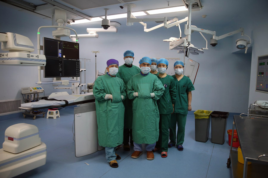 手术完成后,手术团队在手术室合影(摄于1月6日)。在湖南省人民医院的介入复合手术部的手术室里,有一群被称为“盔甲卫士”的医务工作者。为了抵挡做手术时持续X射线的辐射,他们必须穿着沉重的铅服进行手术,如同身着盔甲的生命卫士。介入手术是一种先进的微创治疗术,医生在x光影像设备的引导下,将精细的导管、导丝等引入人体,对体内病态进行诊断和局部治疗。由于其具有创伤小、治疗精准等特点,目前在癌症、血管、神经等方面疾病的治疗上被越来越多地使用。但是手术操作需要长时间在x光射线下进行,因此对医务人员的身体伤害非常大。 1月6日上午,来自湖南省人民医院介入血管外科的副主任医生刘觉仕和方志勇联手为一位肝癌患者进行了介入治疗手术,在持续1个半小时的手术中,刘觉仕、方志勇以及手术团队的医务人员全程穿着20多公斤重的铅服工作,但为了手术操作,小腿、胳膊、手、脸等部位只能暴露在射线之中。据介入血管外科一病室主任张智明介绍,做一台这样的介入手术的x射线量与拍1000多张x光片相同,做完一台手术后医生们往往汗流浃背精疲力尽,而这样的手术刘觉仕和方志勇两位医生每年都要做600台左右。新华社记者李尕 摄