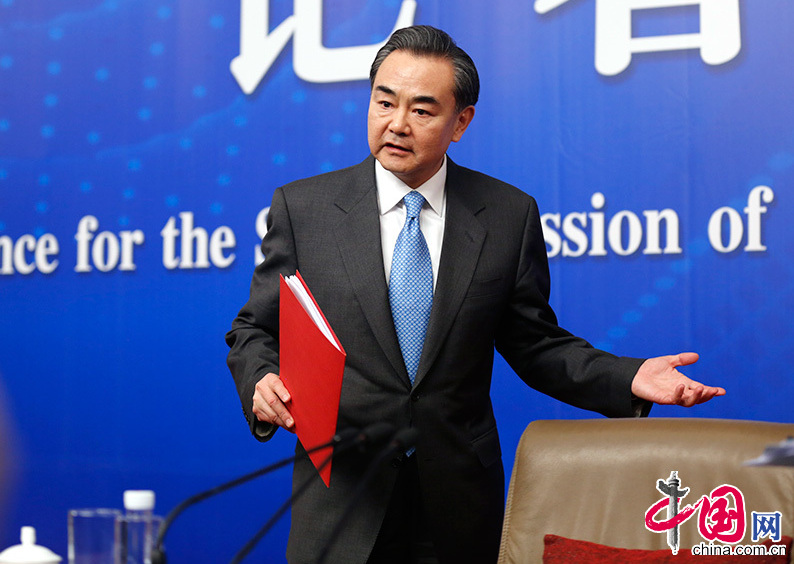 2014年3月8日上午10时,外交部长王毅在记者会上回答完记者提问后,立刻起身离席,表示要赶回去处理马航客机失联事件。中国网记者 董宁摄