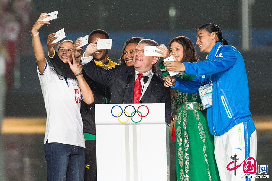 2014年8月16日,南京青奥会开幕式上,国际奥委会主席托马斯·巴赫(中)登场致辞时邀请五大洲的5名旗手与他用手机自拍合影。中国网记者 董宁摄影