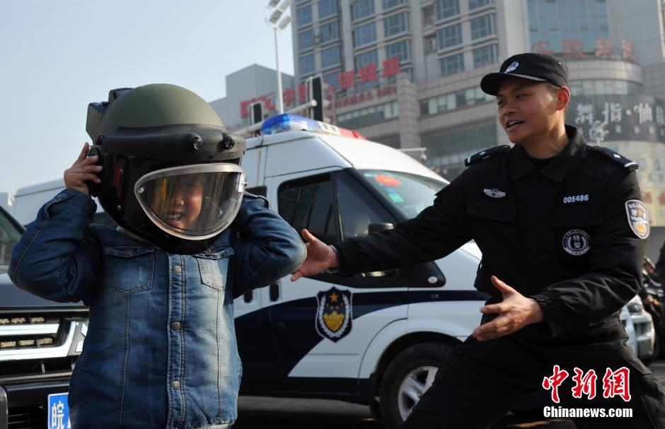 1月10日,现场的防爆装备、排爆器材等装备展示备受热捧,市民零距离体验。当日,安徽合肥警方在合肥杏花公园开展110宣传日亲民活动,各种特警武器展示、警用防爆突击车、防爆罐同“警犬模特”一起与合肥市民“零距离”接触。中新社发韩苏原 摄
