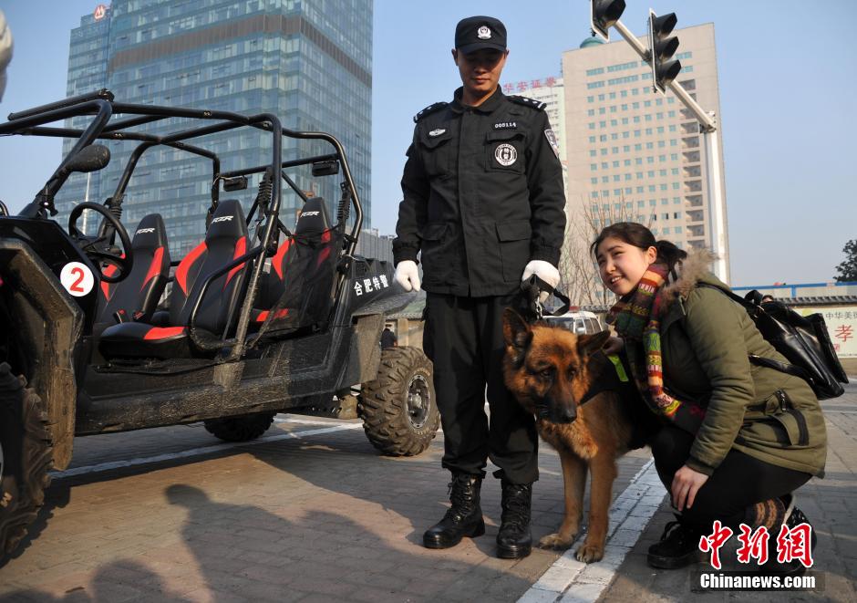 1月10日,现场的防爆装备、排爆器材等装备展示备受热捧,市民零距离体验。当日,安徽合肥警方在合肥杏花公园开展110宣传日亲民活动,各种特警武器展示、警用防爆突击车、防爆罐同“警犬模特”一起与合肥市民“零距离”接触。中新社发韩苏原 摄