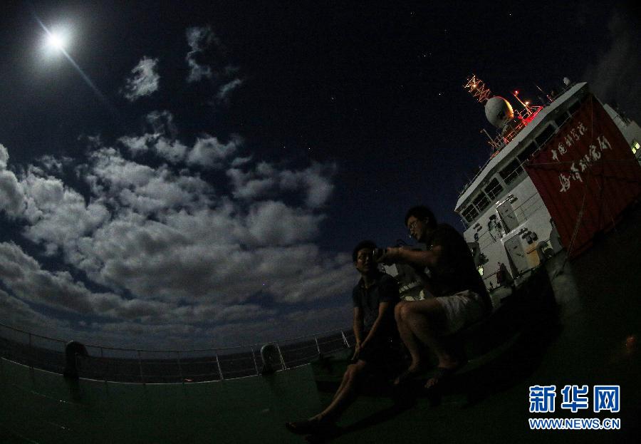“科学”号上的科考队员在前甲板拍摄明月(3月5日摄)。