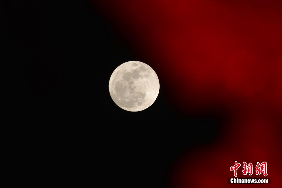 3月5日夜,正值中国传统元宵佳节,北京一轮圆月当空,与华灯相映生辉。中新社发 张浪 摄