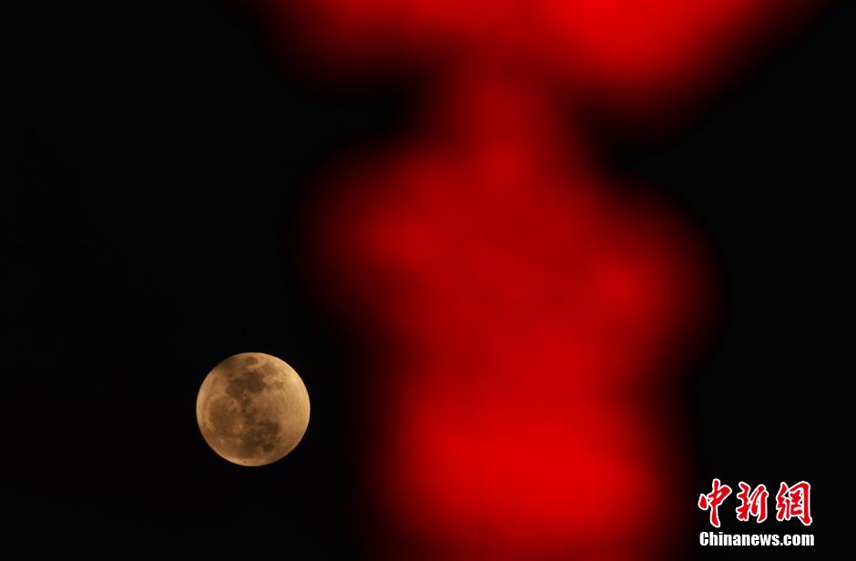 3月5日夜,正值中国传统元宵佳节,北京一轮圆月当空,与华灯相映生辉。中新社发 张浪 摄