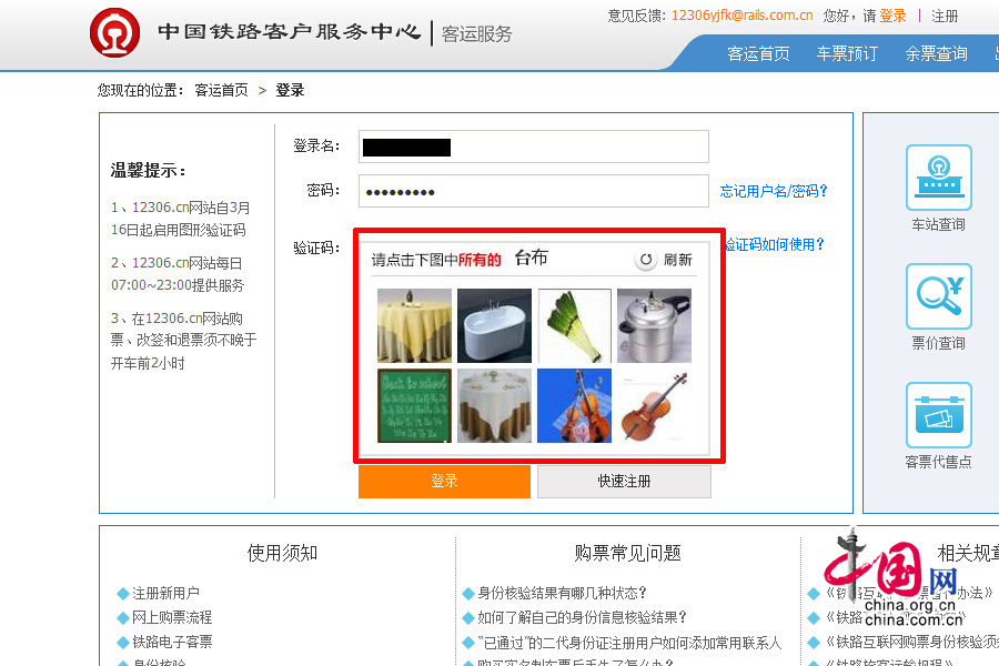 3月16日,中国网记者尝试使用PC端浏览器登录铁路订票系统12306网站。图中红框区域为图形验证码。 中国网记者 张若梦 截图