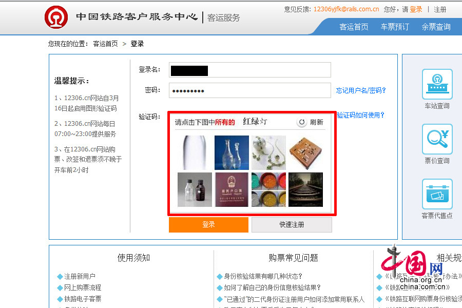 3月16日,中国网记者尝试使用PC端浏览器登录铁路订票系统12306网站。图中红框区域为图形验证码。 中国网记者 张若梦 截图