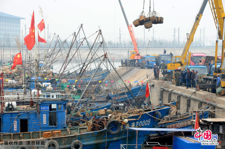 4月12日,养殖户在连云港市西墅渔业码头将刚收割的新鲜紫菜卸船装车。中国网图片库 王春摄影