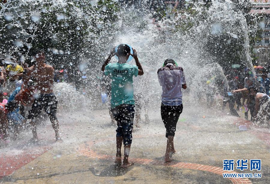 4月15日,人们在云南西双版纳景洪市泼水广场泼水狂欢。泼水节于每年4月中旬举行,是泰国、柬埔寨和缅甸等东南亚国家和我国云南、广西等地的传统节日活动。人们用相互泼水的方式互送祝福、传递欢乐。新华社发(张伟摄)