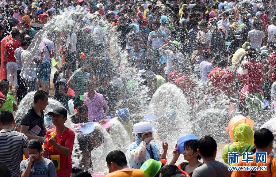 4月15日,游客和当地群众在街头泼水狂欢。当日,云南省西双版纳傣族自治州在澜沧江畔举行迎圣水·送吉祥·取水仪式及泼水狂欢,数十万各族群众和游客在景洪市泼水广场和大街小巷尽情泼水狂欢,庆祝傣历1377年新年。新华社记者杨宗友 摄