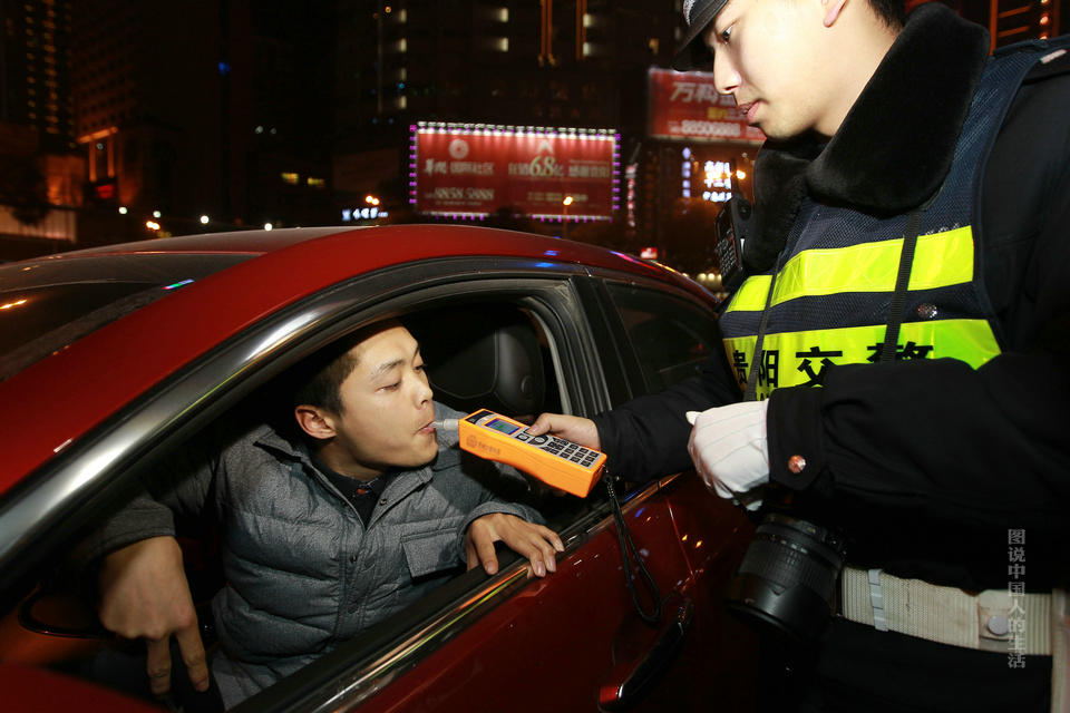 交警使用新型酒精探测仪,在街面上检查酒驾。