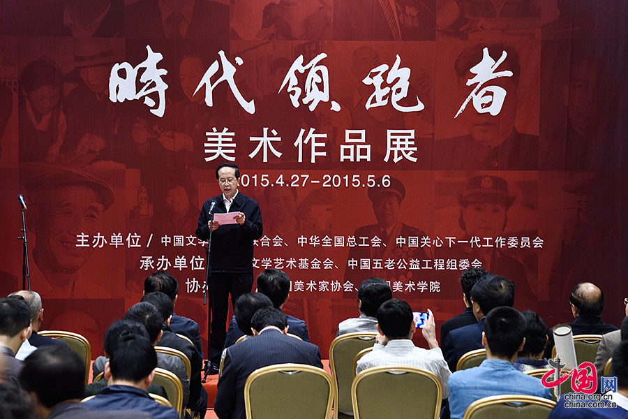 “五一国际劳动节”来临之际, 以记录自上个世纪五十年代以来优秀“劳动模范”为主题的美术展——“时代领跑者”美术作品展于2015年4月27日北京国家博物馆开展。图为中国文联书记处书记、副主席左中一在开展仪式上讲话。 中国网记者 张若梦 摄影
