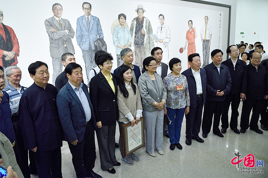 “五一国际劳动节”来临之际,以记录自上个世纪五十年代以来优秀“劳动模范”为主题的美术展——“时代领跑者”美术作品展于2015年4月27日北京国家博物馆开展。图为部分创作团队成员与劳模在画作前合影留念。 中国网记者 张若梦 摄影