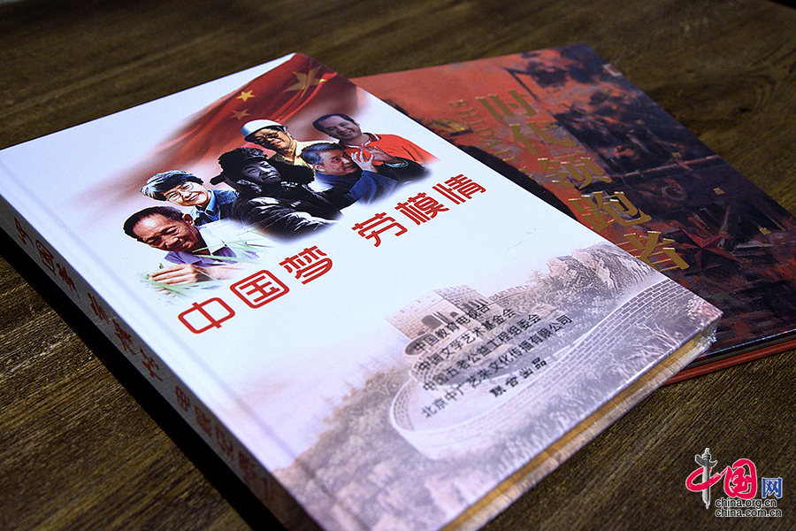 “五一国际劳动节”来临之际,以记录自上个世纪五十年代以来优秀“劳动模范”为主题的美术展——“时代领跑者”美术作品展于2015年4月27日北京国家博物馆开展。图为劳模电视纪录片DVD及《时代领跑者》美术作品集。 中国网记者 张若梦 摄影