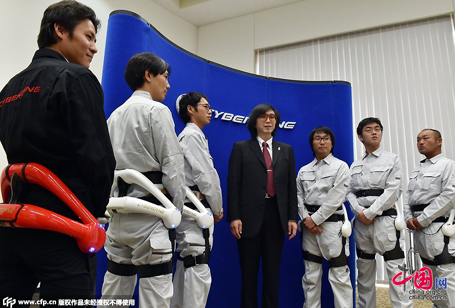 日本东京近郊筑波,筑波大学的教授展示机器人套装“劳动者版HAL”。这个发明可以模仿使用者的动作,把它穿在建筑工人身上,可以帮助工人节省力气。图为2014年9月,筑波大学的教授展示机器人套装“劳动者版HAL”。CFP