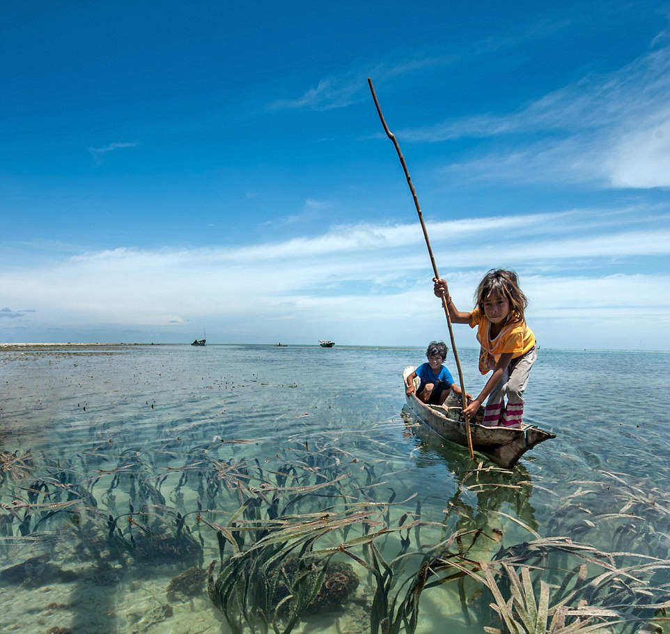 巴瑶族的孩子撑起小船在海里寻找食物。