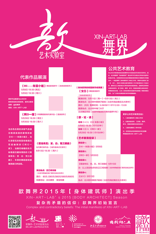 2015年5月至6月,艺术总监史晶歆女士带领歆舞界团队携三部舞蹈剧场代表作品,即将在北京正乙祠戏楼剧场全新登场。作为其独具一格、别出心裁的代表之作,此次上演的三部作品分别由独幕悲剧《HI---朱丽小姐》、环境舞蹈剧场《阿O一家》以及当代舞作品《霞谐帛瓦:觉、白、梵三部曲》构成。