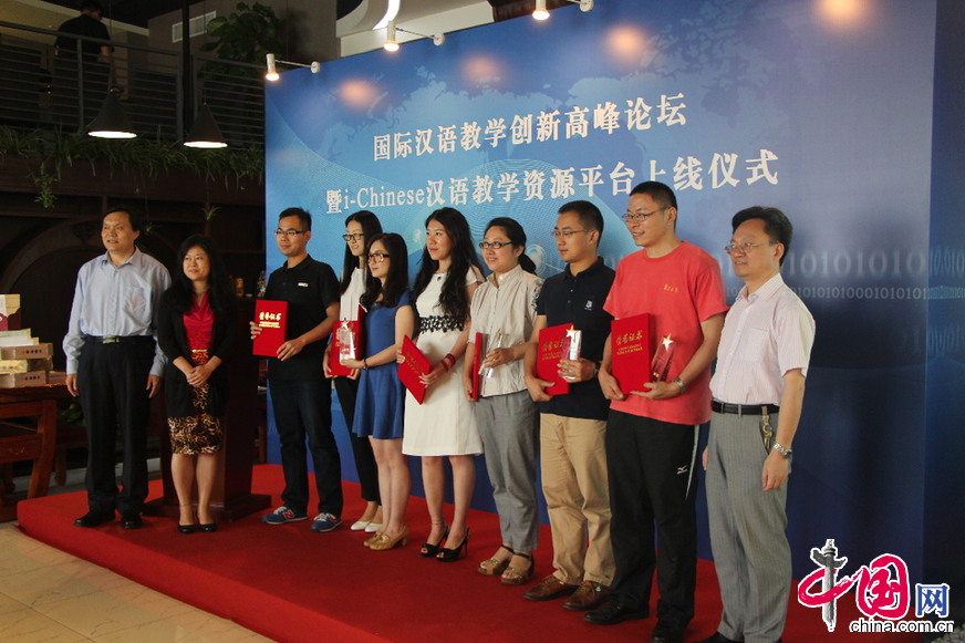 复旦大学国际文化交流学院院长吴中伟教授等嘉宾为获得“i-Chinese”杯国际汉语教学创新大赛的获奖选手颁奖。中国网 鲁楠摄影