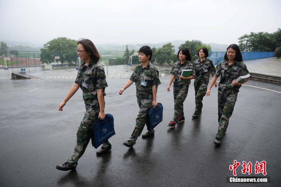 上下课的路上,五位女士官学员按照规定都需要排队进出教室。杨华峰摄