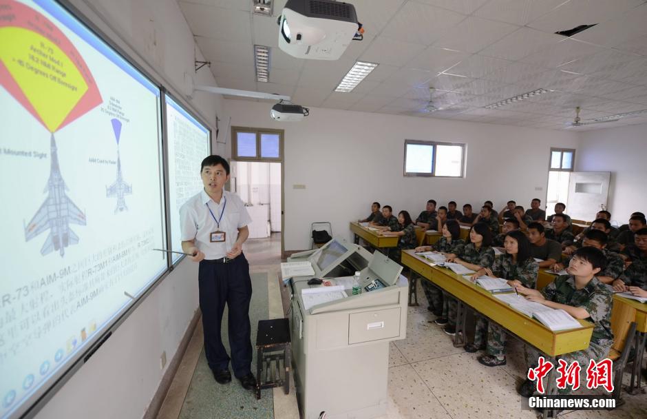姑娘们与男生在教室内上课,老师展示的课件均是飞机大炮等高科技军事武器解析图。杨华峰 摄