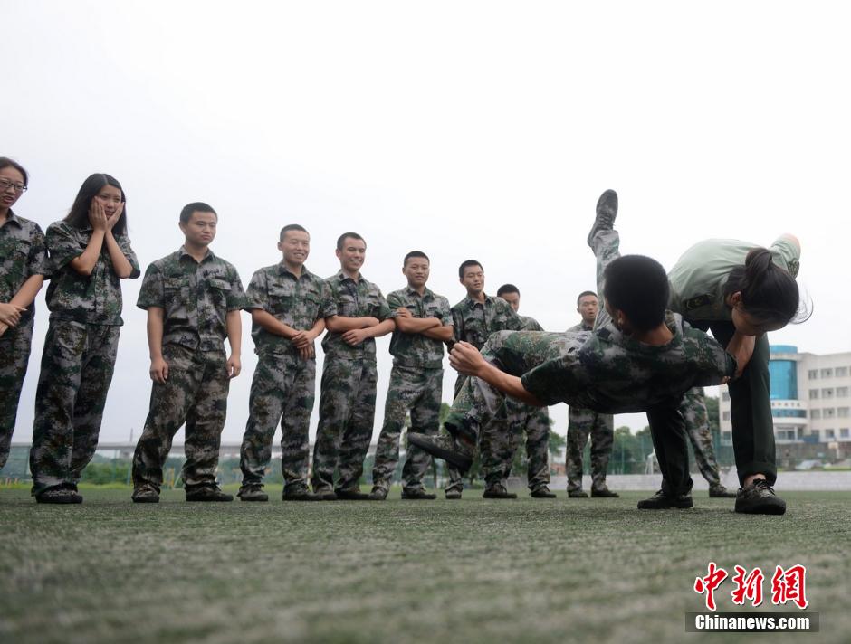 在操场训练课上,特战女战士返校为为学生们演示搏击术。杨华峰摄