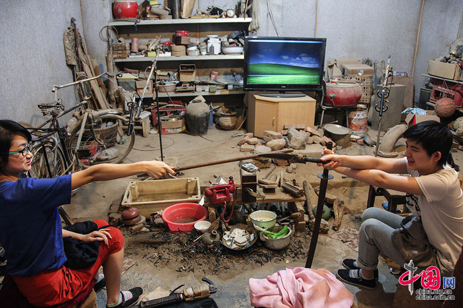 后”拿起道具比划了起来。中国网记者 伦晓璇 摄