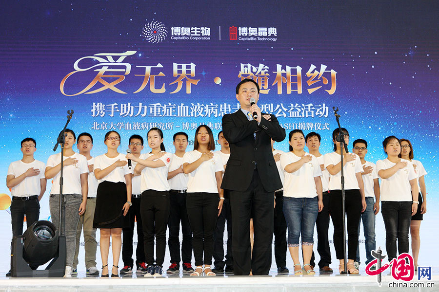 北京大学血液病研究所所长黄晓军教授、博奥生物集团总裁程京院士、博奥晶典总裁许俊泉等领导出席并致辞。随后,来自博奥生物和博奥晶典的近百名志愿者与现场的白血病患儿家属一起举行了加入中华骨髓库的宣誓仪式。仪式结束后,北京红十字会专门在派出的血液采集车上为志愿者采集了血液样本。